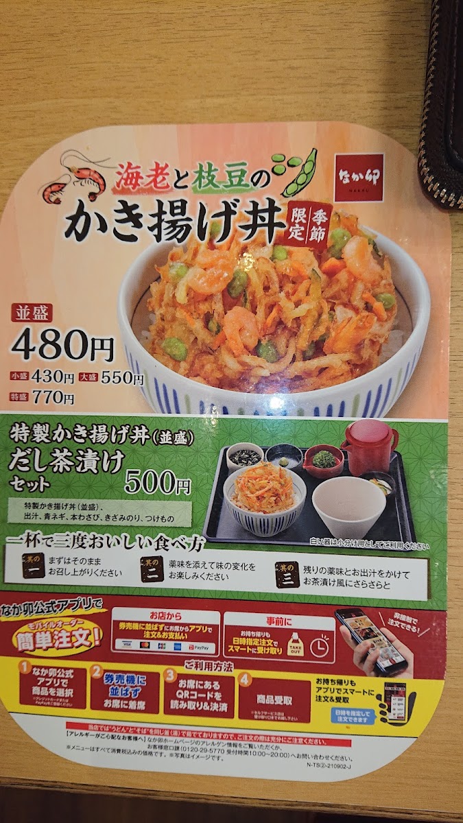 Nakau doesn’t stop at donburi dishes. The menu features an assortment of sides and extras that enhance the dining experience. One of these is the Karaage (Japanese fried chicken), priced at ¥390, which offers crispy, juicy chicken pieces that can complement any main dish.
